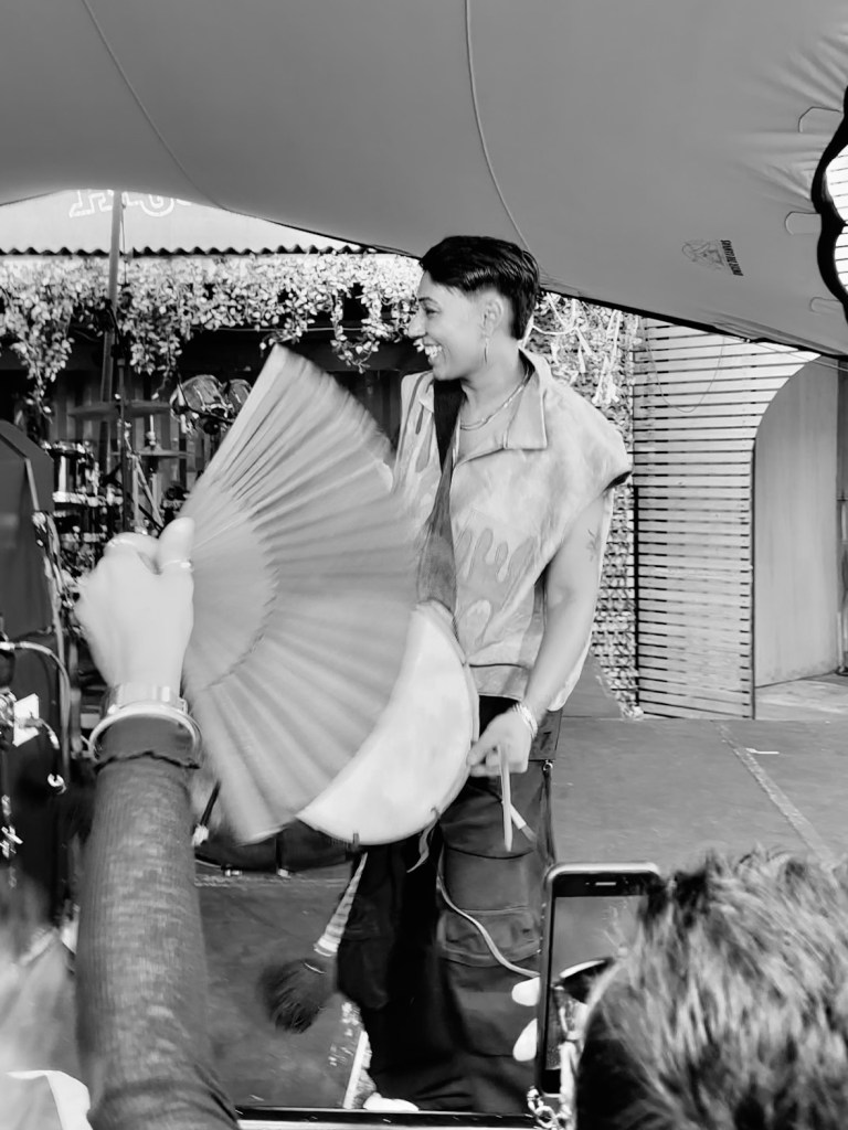 We arrive at the venue and as I approach the end of the security check, I hear this heavy UKG bassline and start smiling. A staff member kindly gave me a token to visit Dishoom—both a comfortable choice for Indian food if you’re ever in London, Birmingham, Manchester or Edinburgh, as well as this year’s festival partner—and ushered me into the colourful, open-air feel of the venue, where I was then promptly directed to the Chillout Zone for some warm, complimentary House Chai, courtesy of Dishoom. Maybe because when we got there, they were still setting up the lighting system on the truss stands in the Courtyard. In their defence, who would’ve expected Asians to get somewhere on time for once? I sat down to sip my chai on a picnic bench alongside strangers, as we made friends over our shared music taste, our outfits and our favourite dosa fillings. As we get up and two-step to the bar outside, I see people barred from the stage with crowd control gates, shouting out to DJ Mahnoor to let them dance closer to her. She got on the mic and called out for us with open arms. Like bees to the Queen Mother, event staff removed the barriers and we flew straight over to her.
