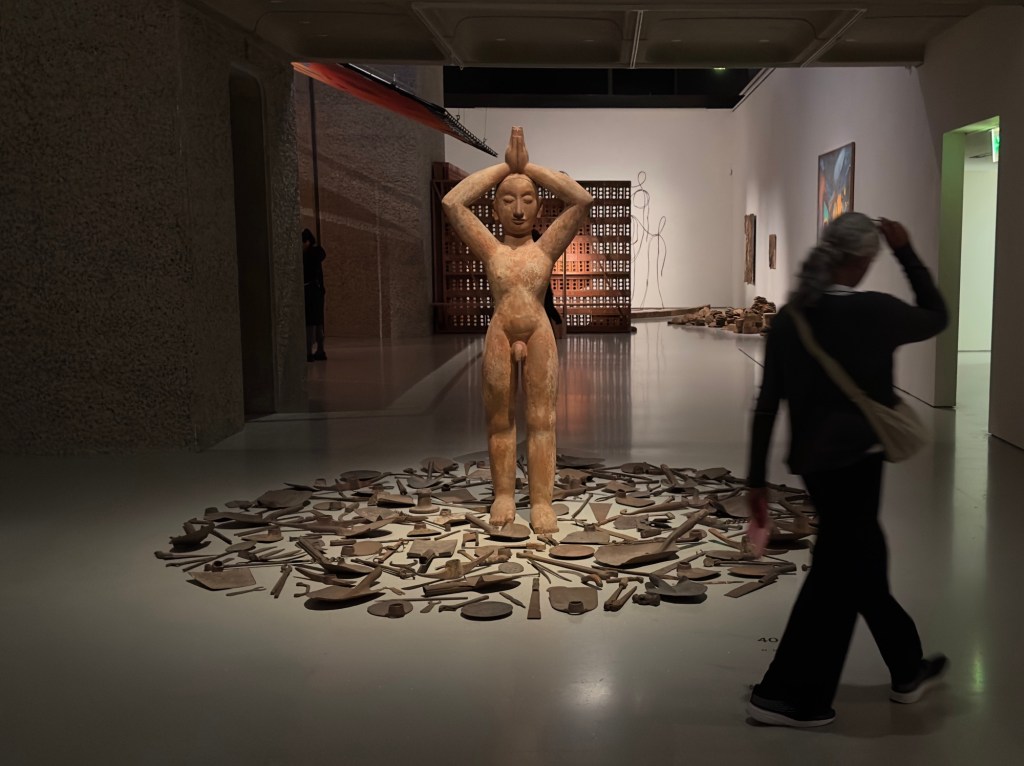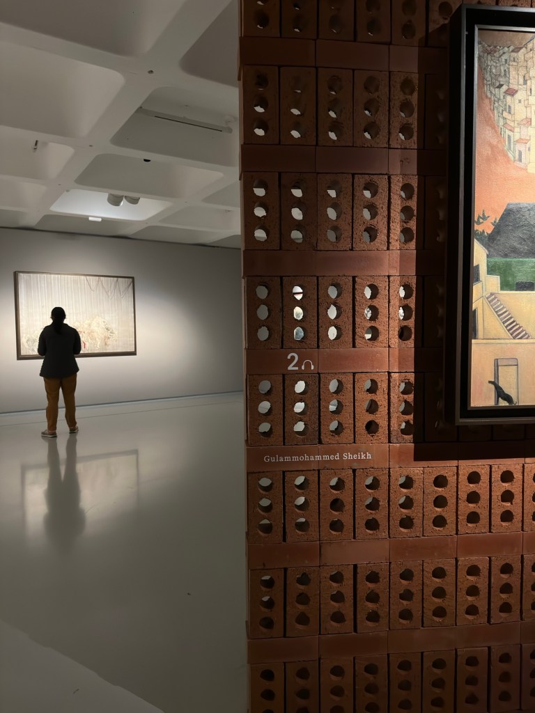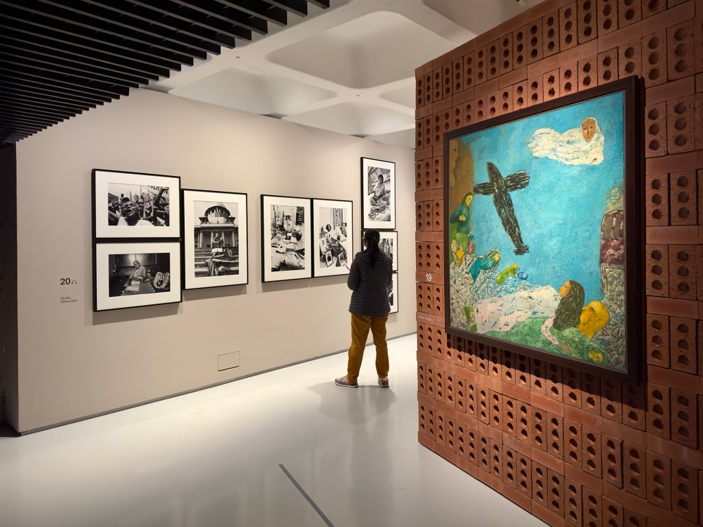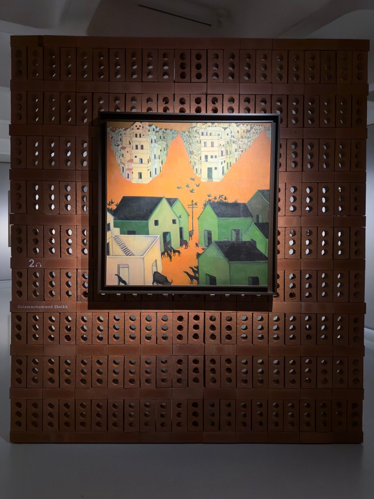 Some of these works are mounted very beautifully on freestanding walls of stacked, jaali-style perforated bricks. The crumbling, terracotta-coloured texture of these bricks brings you closer to the rustic worlds of the smaller villages and cities where the violence of the Emergency ran rampant, as Sanjay Gandhi’s campaign of mass sterilisation subjected more than six million men to forced procedures, torture and mutilations in a year.